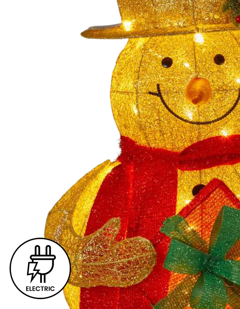 This eye catching 120cm white mesh snowman will look stunning in an outdoor or indoor Christmas display. He comes holding a present and is covered in lights.