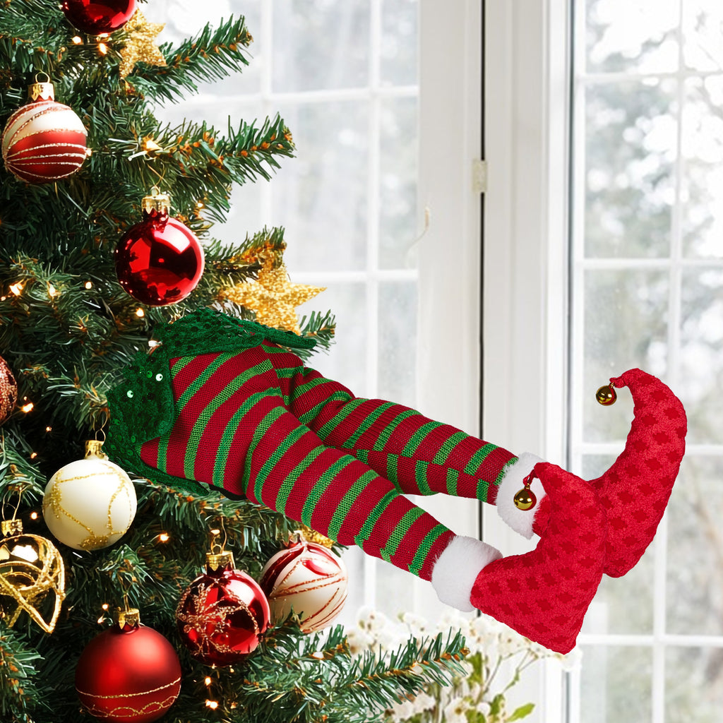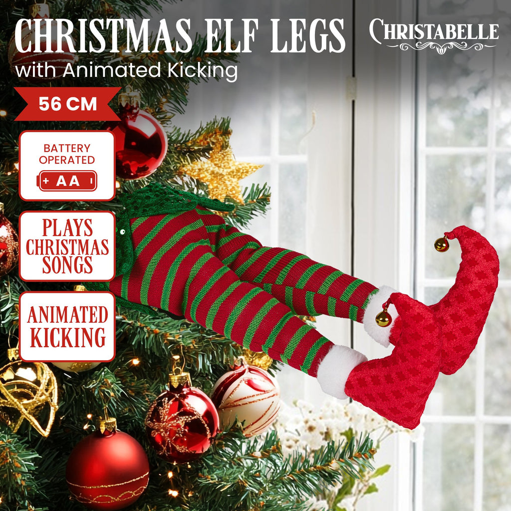 Add some mischief to your tree this year! These whimsical elf legs kick to a cheerful Christmas tune while the bells on his shoes jingle with every move. Battery-operated and easy to attach with a Velcro pole, they bring playful movement and festive fun to your holiday decorations. Key Features: