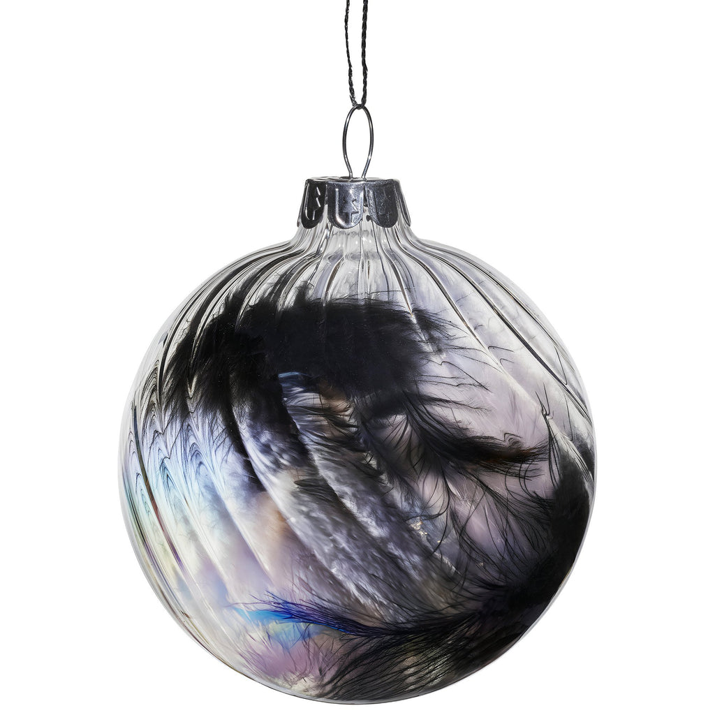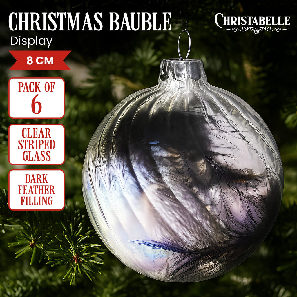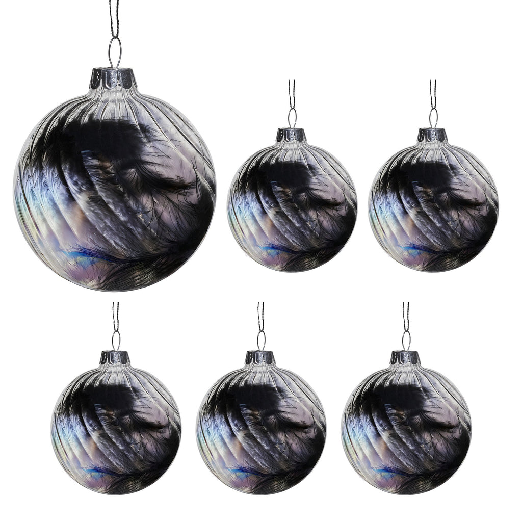 A twist of mystery for your tree. This pack of six 8cm glass baubles features a clear swirl stripe design filled with dark feathers, creating an enchanting blend of texture, transparency and intrigue that elevates your festive décor.