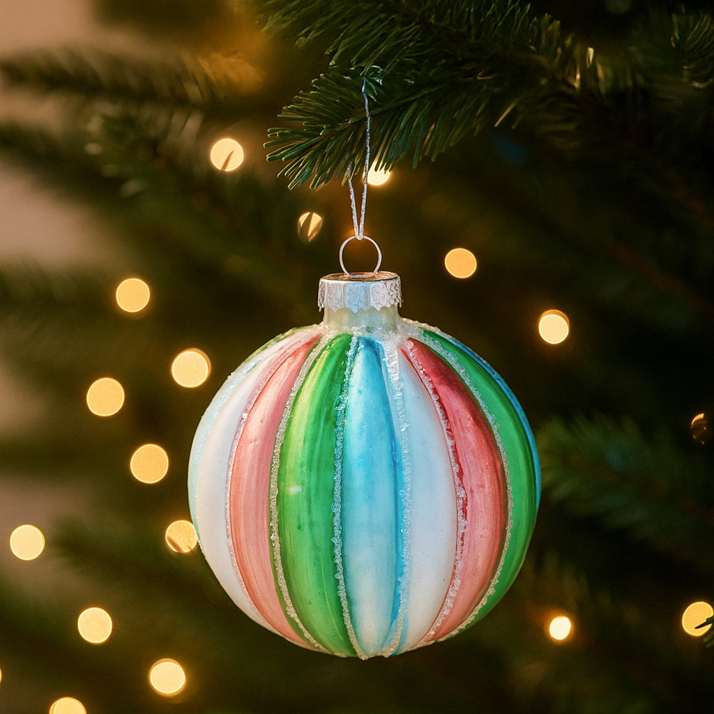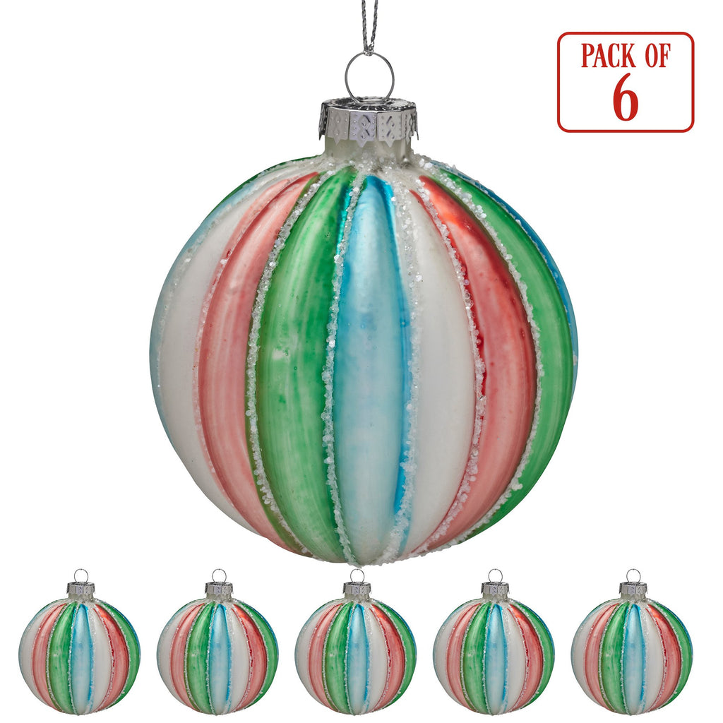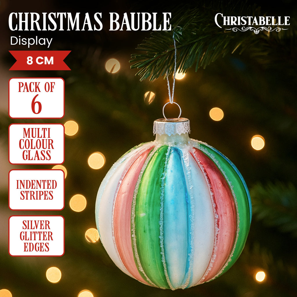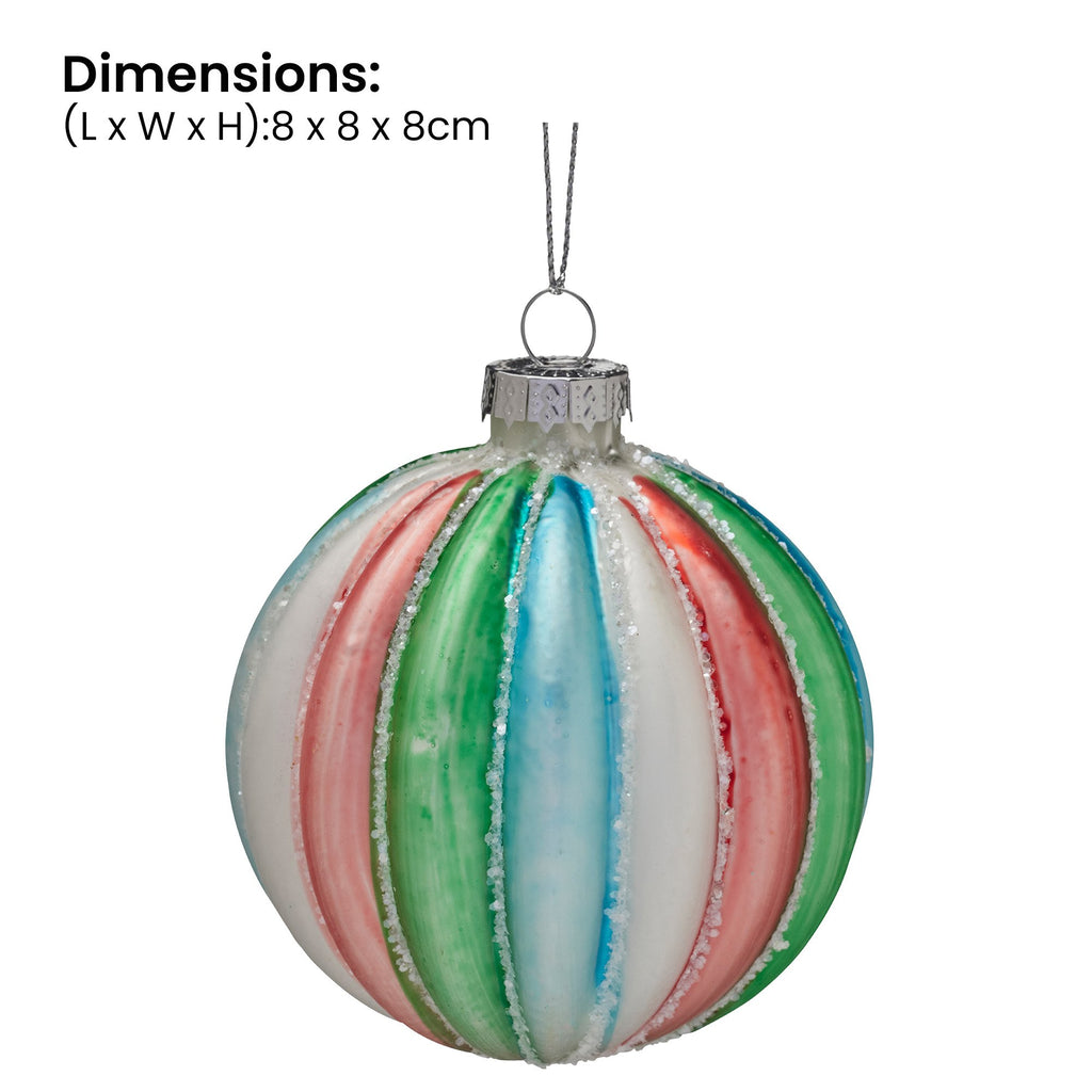 Festive colour meets timeless style with this 8cm glass bauble. Featuring bold multi-colour stripes outlined in silver glitter, the indented design adds texture and depth that sparkle under the lights. A standout addition to your décor, these ornaments come in packs of 6 so you can share or create a vibrant coordinated look on your tree. Key Features: