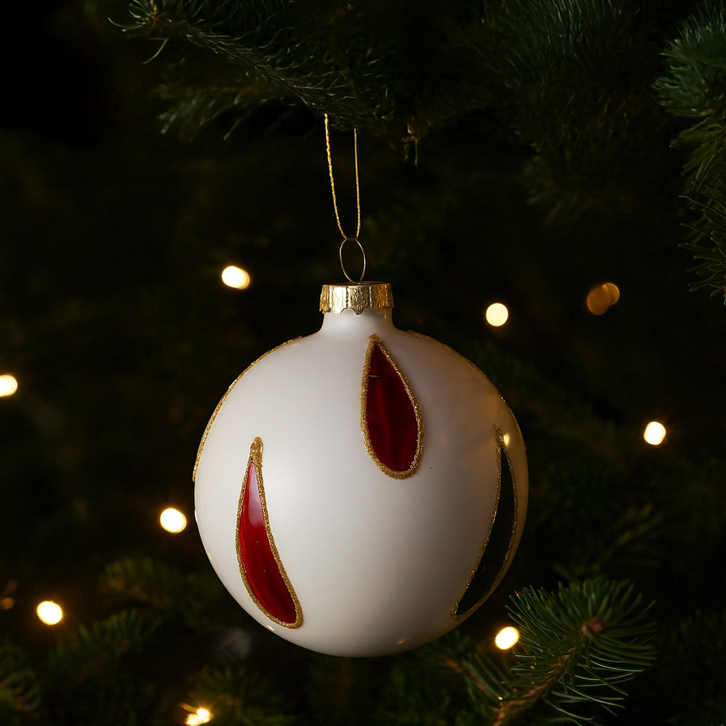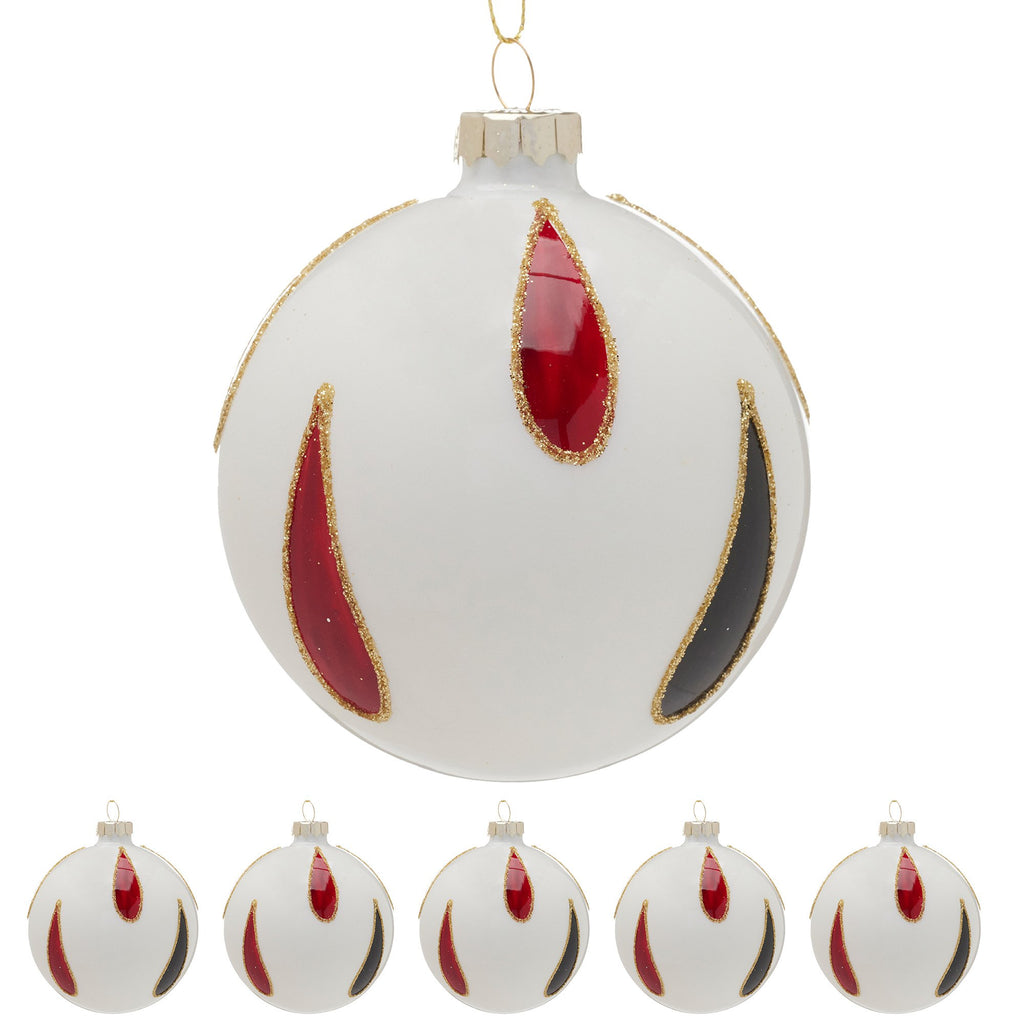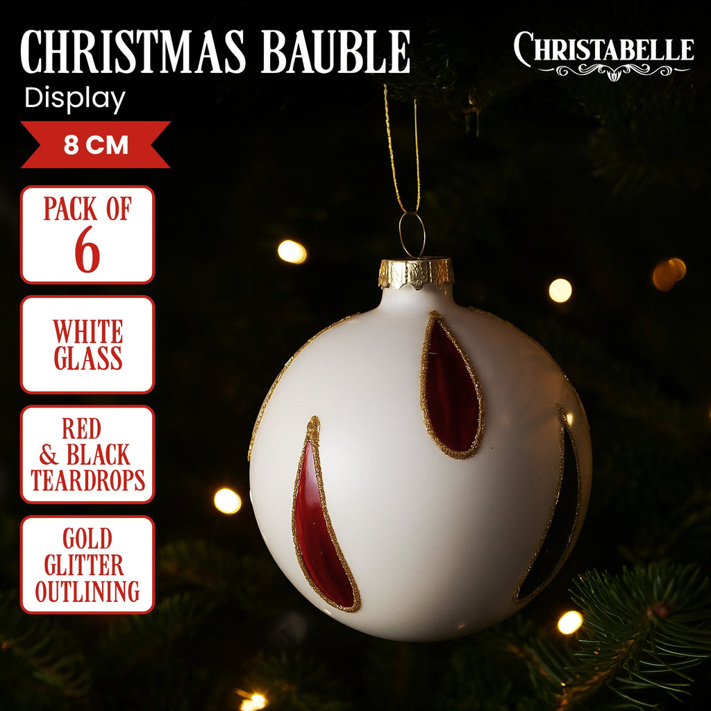 Bring bold elegance to your tree with this striking 8cm white glass bauble. Its red and black teardrop patterns are delicately outlined with gold glitter for a festive shimmer. Perfect for pairing with both traditional and modern themes, these decorations come in a pack of 6, ideal for gifting or creating a cohesive display. Key Features:
