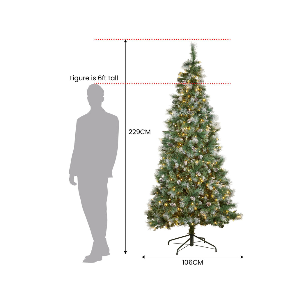 Turn your living space into a magical Christmas setting with the sophisticated Bayville Pine Christmas Tree. At a height of 7.5ft (229cm) and a width of 106cm, this tree is adorned with 400 warm white LED lights that create an elegant and delightful twinkling effect. The branches are interspersed with pine cones, enhancing the trees lifelike beauty. With 1068 tips on hinged branches, it presents a lush and full look, ideal for displaying your treasured ornaments. Crafted from durable PVC and steel, the Bayville Pine Christmas Tree provides a stunning and festive focal point for your holiday celebrations. Key Features: