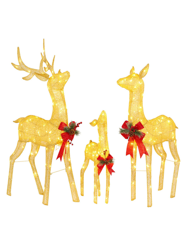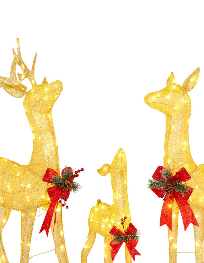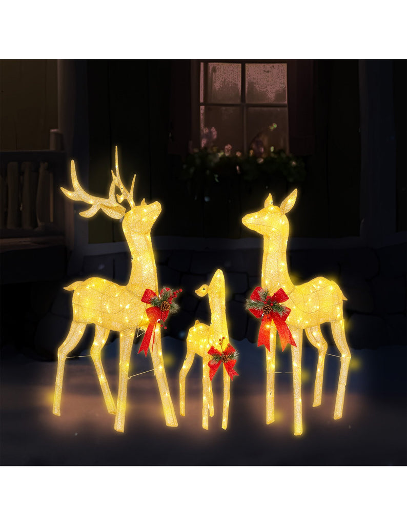 Amaze everyone with this stunning reindeer family. This set of 3 has a gorgeous white mesh that shines at night and is designed for outdoor use. And with their glittery finish and lights will make a huge impact. 65, 100 & 120cm High. 50, 70 & 80 LED lights respectively with individual power cords. Key Features: